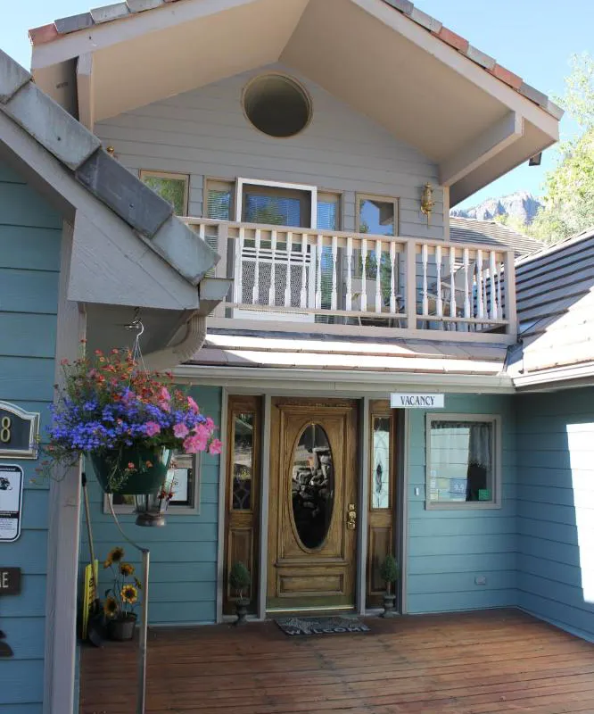 The hotel offers a large breakfast, a hot tub, and a third-floor lounge with stunning mountain views.