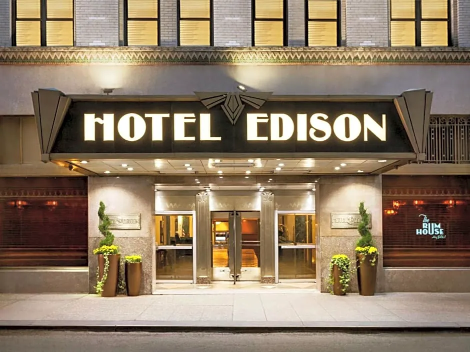 Ideally located in Times Square, this Manhattan hotel has been around since 1930. With distinct influences of the Art Deco era in the design of the lobby and the exterior, Hotel Edison offers Classic and Signature rooms and suites. Each room and suite features flat-screen cable TV. The private bathrooms are equipped with a hairdryer and free toiletries. Air conditioning is also included. The Hotel Edison in Manhattan offers concierge service, 24-hour business and fitness centers and a transportation desk. The Edison Ballroom provides event space. Room service is available for limited hours. The Rum House, featuring a copper and wood themed design, is only a minute away from Edison and offers live entertainment on occasion. The on-site restaurant, Bond 45 serves a vegetable antipasto bar and a menu that includes veal chops and seafood. Friedman's, the restaurant that has "Eat good food" as their mantra, is also open in the Edison. Rockefeller Center is 2641 feet from The Edison while the Empire State Building is 1 mi away. The Jacob K. Javits is 1.2 mi from The Edison Hotel.